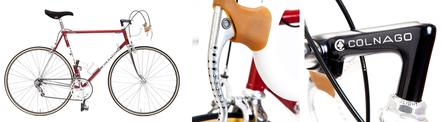 Ernesto Colnago´s steel frame Mexico from the early 1980s was a lighter alternative compared to the Colnago Super. The complete Campagnolo Super Record group was fitted with original pantographic Colnago rarities, such as the chain wheel, the seat post, the stem and the gear control lever.