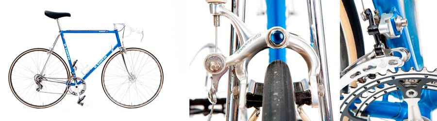 (DE) Dieses Dreambike wurde im originalen Brooklyn Blue restauriert, die Decals wurden reproduziert und unter dem Klarlack aufgebracht. Die wunderschöne Campagnolo Super Record Gruppe ist in neuwertigem Zustand und die Achsen sind aus Titan. Der Lenker ist von Hand in weißem Glattleder eingenäht.. Der San Marco Concor Profil Rennsattel rundet das klassische Design perfekt ab.