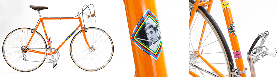 (DE) Zwei dieser Colnago Super wurden von DaCorsa liebevoll neu aufgebaut. Die Rahmen sind sandgestrahlt und auf kleinste Beschädigungen geprüft. Sie bekamen eine Pulverbeschichtung in Molteni Orange, die originalgetreu rekonstruierten Labels, und wurden schließlich hochglänzend klar lackiert. Die Muffen am Steuerrohr sind in Chrom ausgespart, was die Colnago Super-Rahmen seit jeher kennzeichnet. Die verbauten Teile sind durchweg NOS (New Old Stock) und hochwertig restaurierte Campagnolo Super Record bzw. Record Originalteile aus den 1980er Jahren.